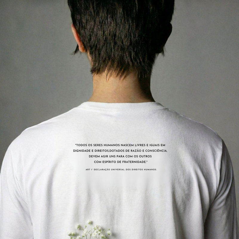 Peça com modelagem oversized, confeccionada em 100% algodão, com toque macio e respirável, Na frente, apresenta a estampa autoral “Amor e Justiça Social”, e nas costas, traz como estampa o Artigo 1º da Declaração Universal dos Direitos Humanos. Criada com muita verdade e carinho, nossas peças são ferramentas de expressão, conscientização e alento. <3 Se você tiver qualquer dúvida sobre a marca, estampa ou material, pode nos enviar um whats, viu?!